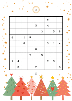 Christmas Sudoku volume 23 with mixed levels for hours of mindfulness. One puzzle per page with Christmas theme. Print these at home and enjoy hours of mindfulness. 160 puzzles with solutions. A4 size for home printing or adjust to your desired size on your printer’s settings.